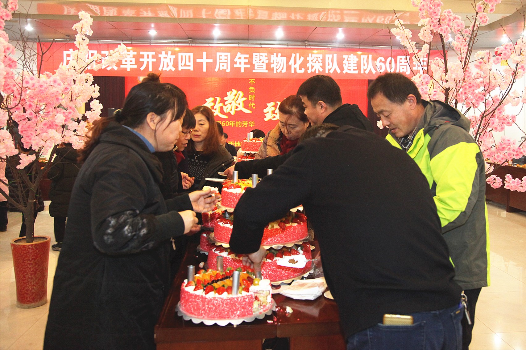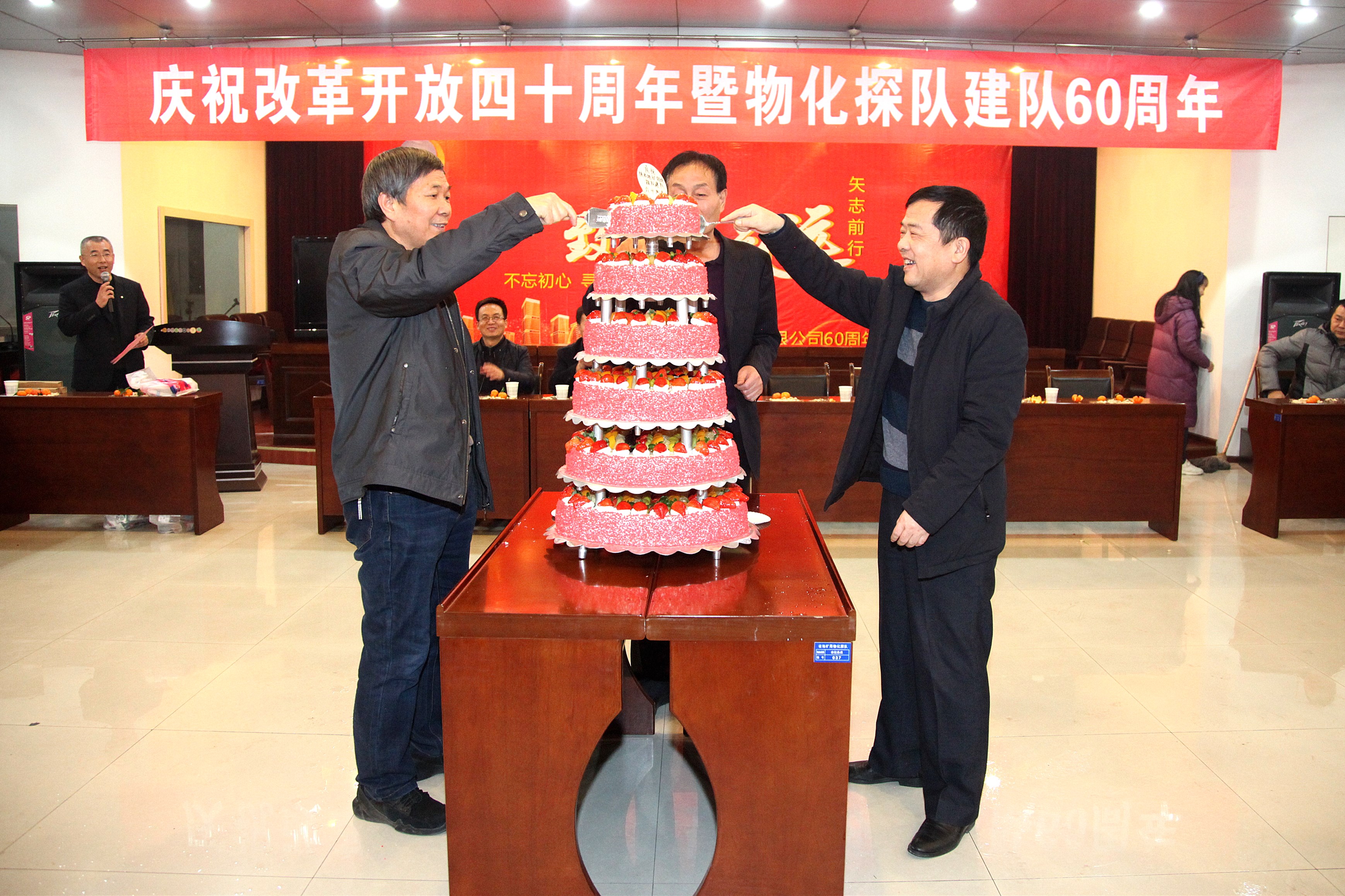 ? ? 活動中,三位副咨詢員共同切開了象征美好向上的蛋糕;用香檳開啟了美好的祝福。職工們吃著甜美的蛋糕、喝著幸福的香檳酒、共敘60年發(fā)展歷程、參觀展出、快板《物化探隊贊》、物化探隊歷史大事件的競答、一首首紅歌演唱、歡快的舞蹈等,在冬日里串起濃濃的喜悅之情。在全體職工齊唱的《東方紅》歌曲聲中慶祝活動圓滿落下帷幕。