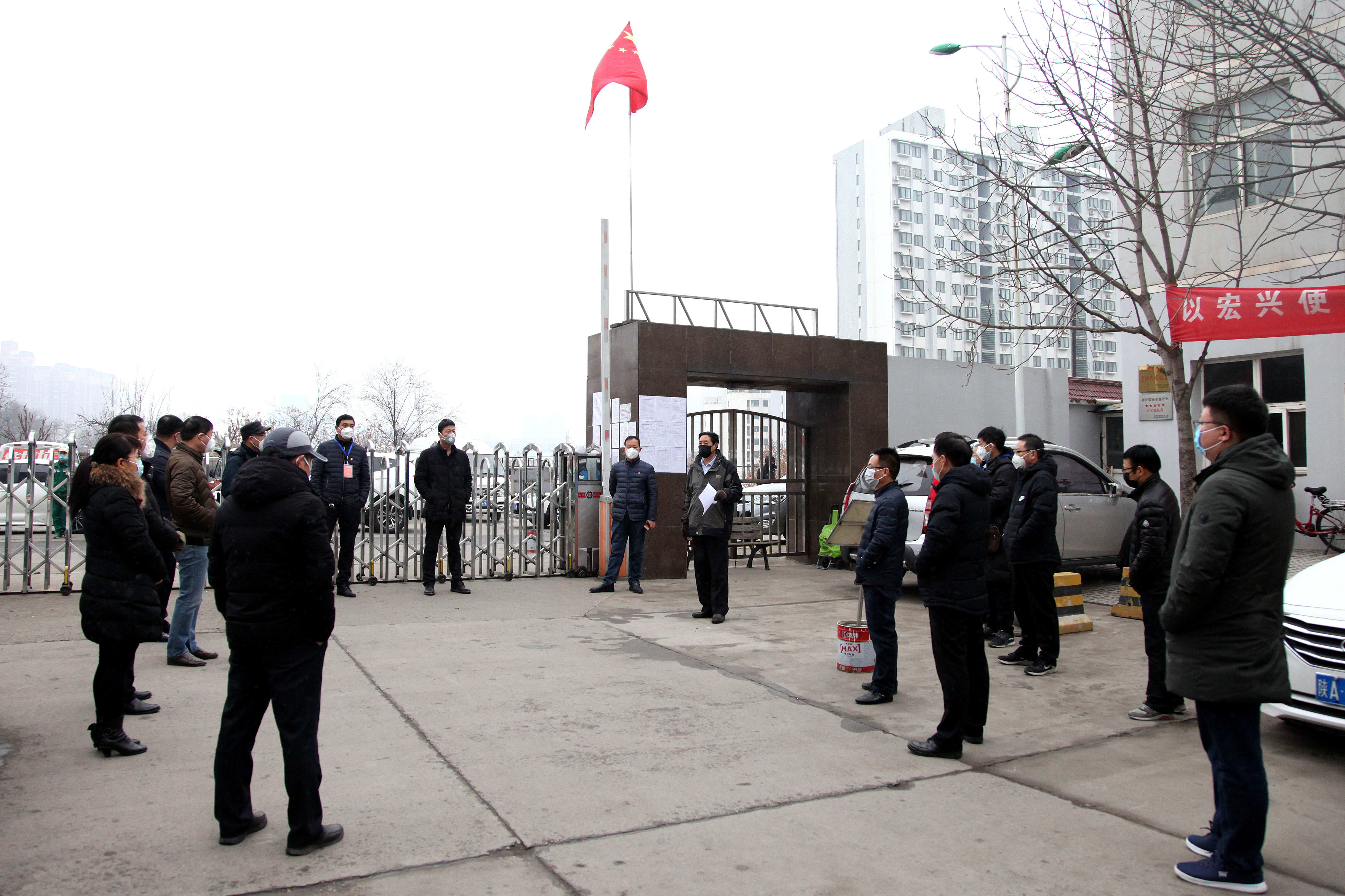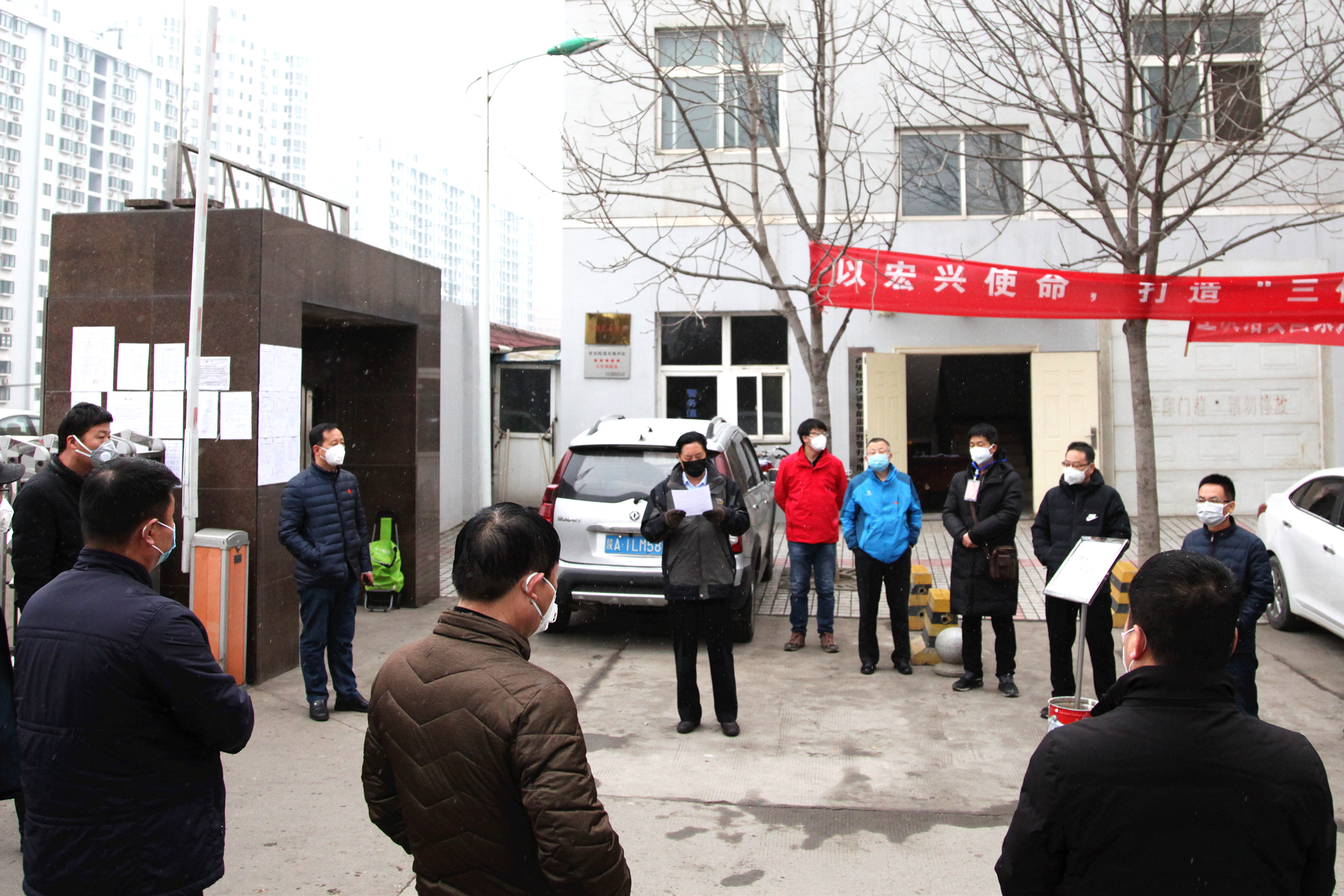 ??? 2月6日上午,黨委書記、執(zhí)行董事、總經(jīng)理王新坪在單位小區(qū)門口值班現(xiàn)場,冒著小雪主持召開了中層以上干部緊急會議,對前期疫情防控工作作了簡要總結(jié),對下一步工作做了再部署、再落實(shí)。