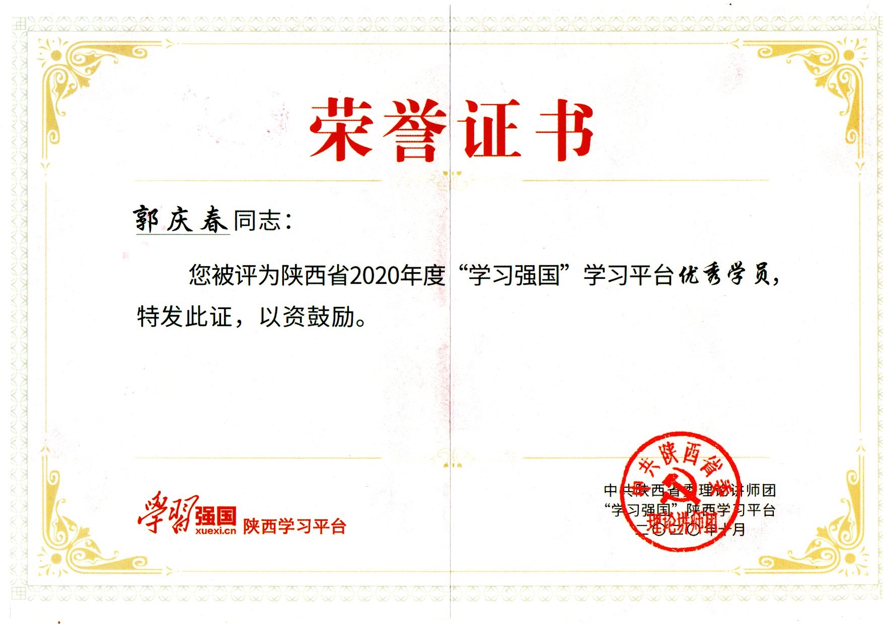 ? ? 近日,我公司周至管理處黨支部黨員郭慶春同志,榮獲陜西省2020年度“學習強國”學習平臺優秀學員稱號。