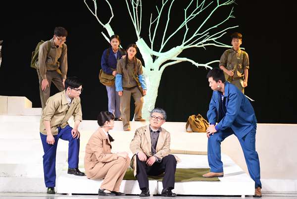 ? ? 場(chǎng)景中的小喇叭廣播再一次開(kāi)始播報(bào)新聞,新聞的播報(bào)讓正拿著一堆科研手稿準(zhǔn)備給自己老師的雅坤瞬間撲倒在地。是的也讓我們的心跟著揪起來(lái),就算我們已經(jīng)知道這位偉大的地質(zhì)力學(xué)之父、共和國(guó)第一位地質(zhì)部長(zhǎng)、中國(guó)科學(xué)協(xié)會(huì)第一任主席、這面旗幟—李四光先生已經(jīng)離世,但是我們還是為這小喇叭播報(bào)李四光先生的隕逝而悲痛。雅坤逐漸在兄弟廣生的悲劇和老師去世的陰影中走了出來(lái),踏著老師的足跡帶著兄弟的夢(mèng)想依然在科研工作中奮戰(zhàn),繼續(xù)發(fā)展老師的研究成果。到此話劇《大地之光》已經(jīng)結(jié)束,可李四光先生精神魅力猶如他的名字一樣光照四方!