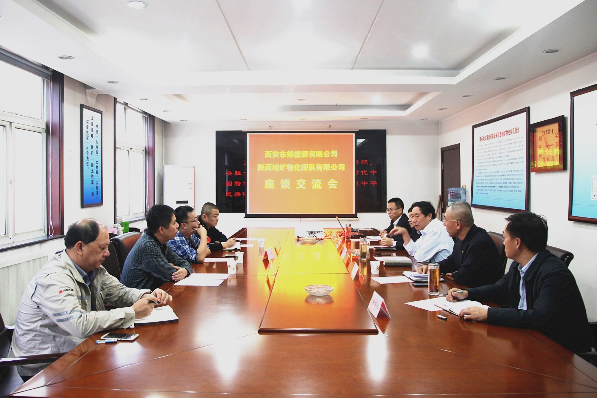 ? ? 9月29日下午,物化探隊有限公司與西安東郊能源有限公司總經理曹瑞一行4人進行了交流座談,雙方就地熱能開發利用、地熱資源調查評價及地下管線探測等方面進行了交流座談。